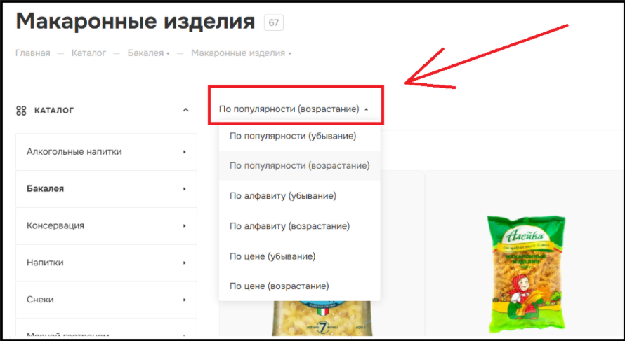 • Вы можете отсортировать товары по цене (сначала дешевые или дорогие), по популярности или по алфавиту. Для этого найдите над списком товаров выпадающее меню (рис. 3)